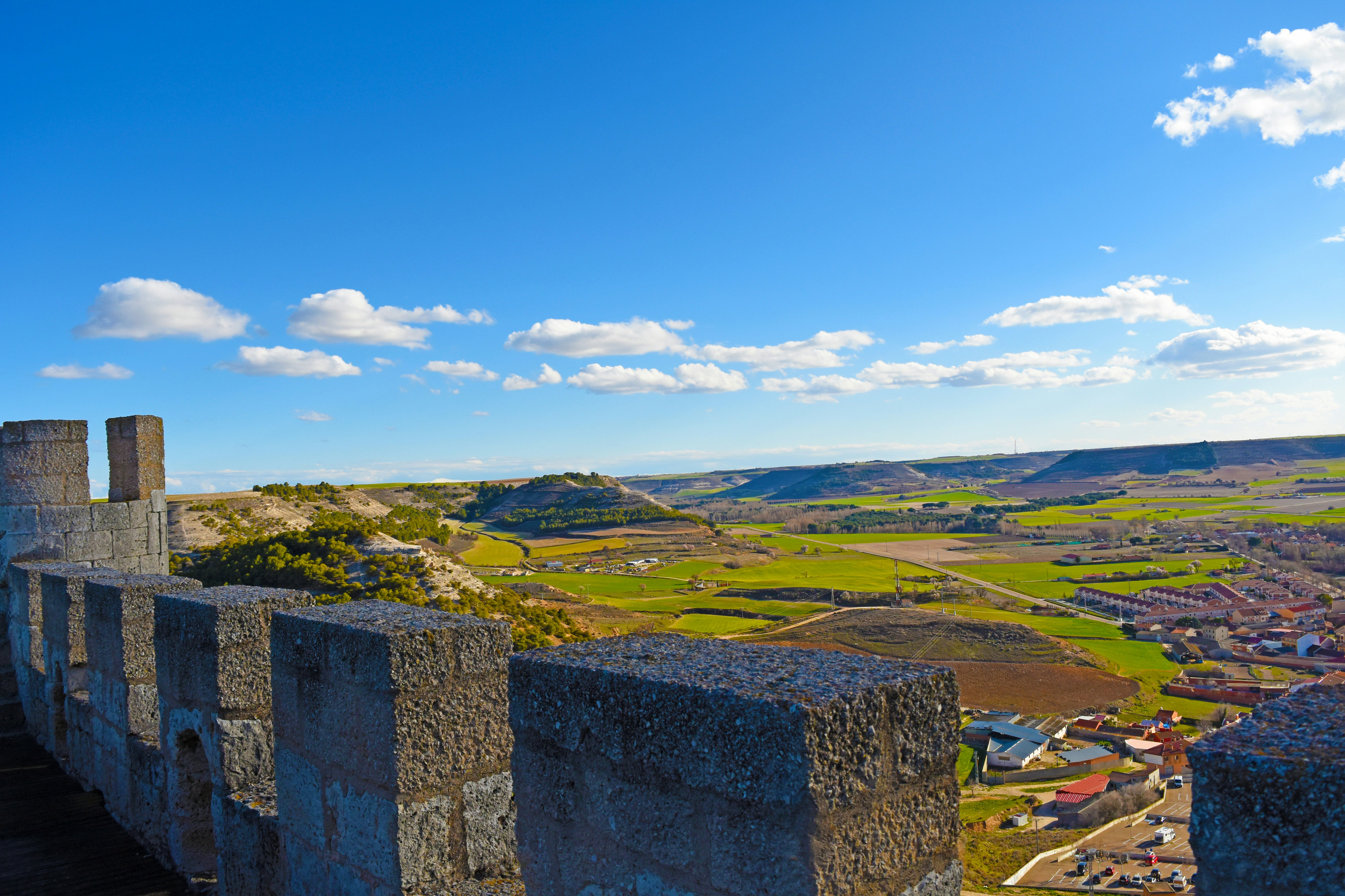Peñafiel og Castillo de Peñafiel eru staðsett í fallegu bænum Peñafiel, í prófensinu Valladolid, í sjálfstýrandi samfélagi Kastíll og León, Spánn. Bæinn er fullur af sögu og þekktur sem mikilvæg miðstöð víngerðarinnar. Hann samanstendur af nokkrum torgum með hefðbundinni arkitektúr, þar á meðal fallegum miðaldarahorni sem stolt stendur á hæð yfir borginni. Castillo de Peñafiel er stórkostlegt sjónarspil með háum feodálveggjum og turnum og veitir góða innsýn í sögu bæjarins. Þar má einnig njóta glæsilegs útsýnis yfir Dúero dalinn, umboðið af útsýnisstöðum kastalans og turnanna. Peñafiel er ríkt af áhugaverðum minjasteinum, svo sem kyrkju og glæsilegum höll. Í borginni finnur þú líka fjölbreytt úrval af verslunum, quánum og veitingastöðum þar sem hægt er að smakka á hefðbundnum spænskum réttum. Allt í allt er Peñafiel og Castillo de Peñafiel frábær áfangastaður fyrir ferðamenn og ljósmyndara sem vilja kanna stað með ríkri sögu og náttúru fegurð.