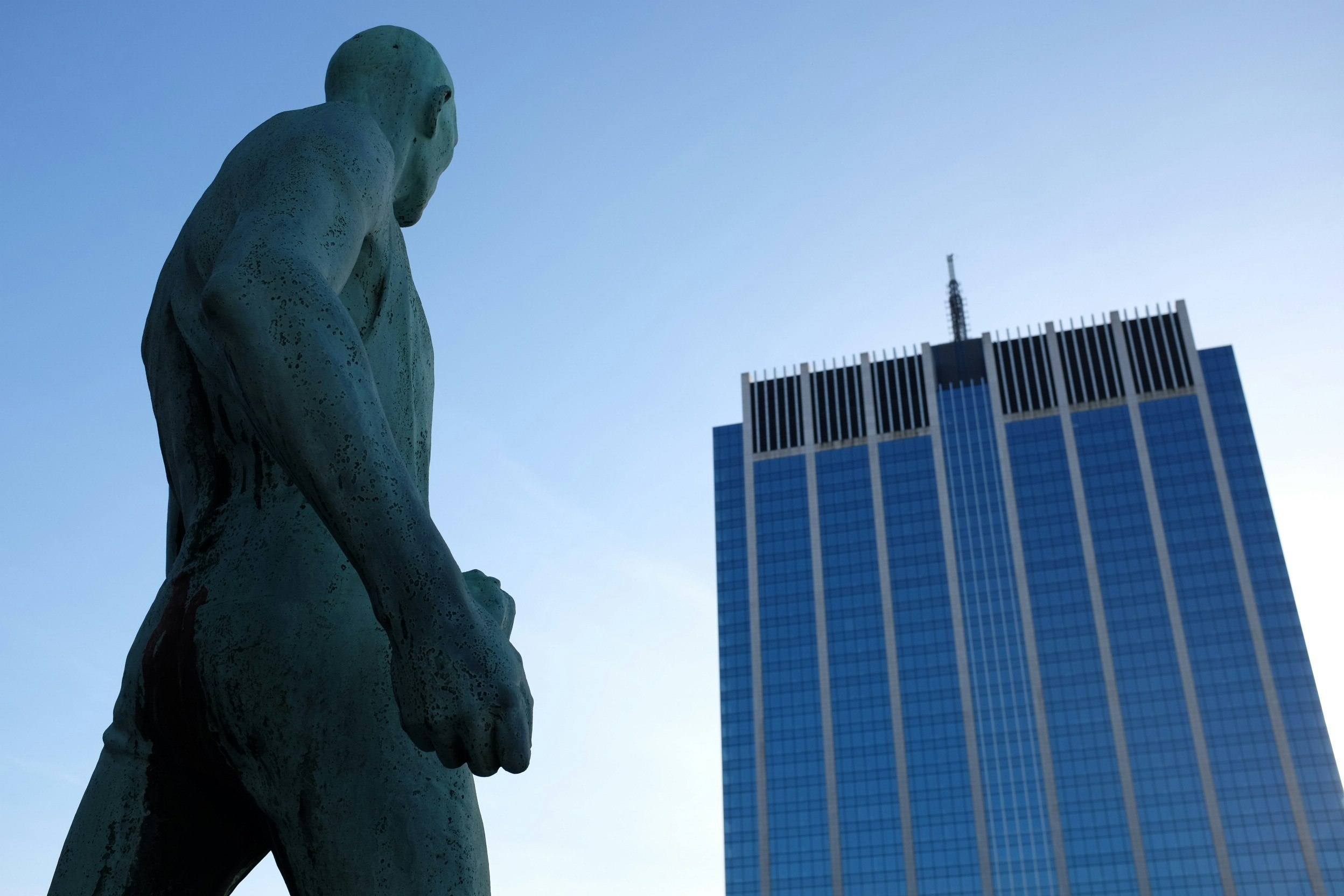 Hinn frábæri 15 metra hái Statan og Fjármálaturninn í Saint-Josse-ten-Noode, Belgíu, er eitt af hæstu og áberandi opinberu listaverkum í Evrópu. Hann er staðsettur í miðju hringlaga torgs og tvískipta uppsetningin er öflug tjáning ríkulegrar sögu svæðisins. Statan er tákn um mannlega sköpun sem birtist í nútímaformi, á meðan Fjármálaturninn er óbein mynd af viðskipta- og fjármálasögu borgarinnar. Auk þess inniheldur uppsetningin leikandi og ljóðræna þætti sem heiðra sögu borgarinnar, oft kölluð „Little Africa“ vegna fjölbreytileika hennar. Statan og Fjármálaturninn eru ómissandi fyrir gesti og bjóða frábær myndatækifæri til að fanga áhrifamikla stærð og dynamískt form.