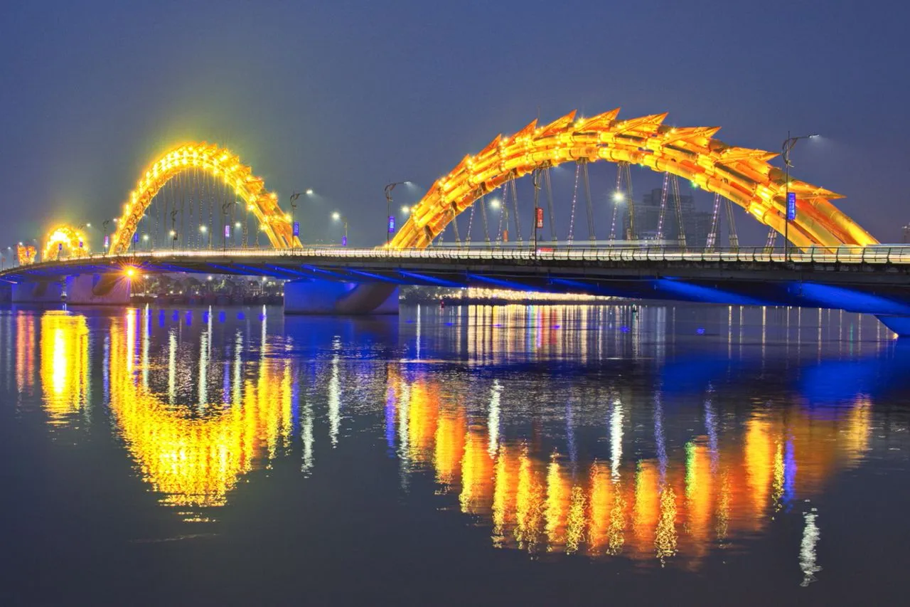 Il Ponte del Drago, a Hải Châu, Vietnam, è uno dei punti di riferimento più iconici della città. Soprannominato il "Drago d'Oro", il ponte è lungo 619,512 metri e alto 8,5 metri. È un punto di riferimento straordinario, illuminato con colori ipnotizzanti di notte e visibile da molti diversi punti panoramici della città. La forma unica del ponte è stata ispirata dal leggendario drago marino che fa parte del folklore vietnamita. Non c'è modo migliore per esplorare le viste di Hải Châu che da questo ponte. Il ponte è facilmente accessibile dal centro città e offre viste mozzafiato dei suoi punti di riferimento, come l'Opera di Hải Châu e la Torre Trần Thị Liệt. Con i suoi colori vibranti, il Ponte del Drago è uno spettacolo da ammirare sia di giorno che di notte.