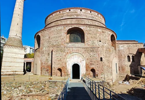 La Rotonda a Salonicco, in Grecia, è un prodigio architettonico risalente all'inizio del IV secolo d.C. Inizialmente costruita come mausoleo per l'imperatore romano Galerio, divenne una chiesa cristiana, poi una moschea e oggi funziona come museo. Questa imponente struttura cilindrica vanta una cupola centrale che raggiunge un'altezza di 30 metri, decorata con mosaici paleocristiani in oro tenue e toni terrosi che catturano scene bibliche squisite, sebbene molte siano parzialmente conservate. La sua acustica è notevole, rendendola un luogo ideale per esibizioni musicali. Gli appassionati di fotografia apprezzeranno l'intricato mix di influenze romane, bizantine e ottomane, e la luce che filtra attraverso l'oculo centrale offre contrasti drammatici, specialmente durante il tramonto.