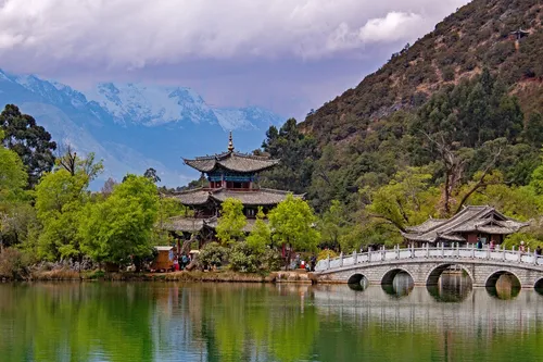 黒龍潭(ヘイロンタン)、別名ブラックドラゴンプールは、麗江市にある玉龍雪山を背景にしています。この静かな池は、壮大な山々と周囲の伝統的な建築を映し出す鏡のような水面で有名で、特に照明が柔らかくなる夜明けと夕暮れに写真撮影の絶好のチャンスを提供します。周囲の公園には、象徴的な抱月亭や特徴的な石の橋を含むいくつかの歴史的な名所があります。自然と風景写真に最適な場所であるこの公園は、多種多様な地元の動植物を有し、自然の美しさと文化的要素を一体化して撮影するのに最適です。訪れる人々は、自然と人間の手による構造が巧みに融合し、ナシ族文化の本質を捉えた調和のとれた環境を楽しむでしょう。