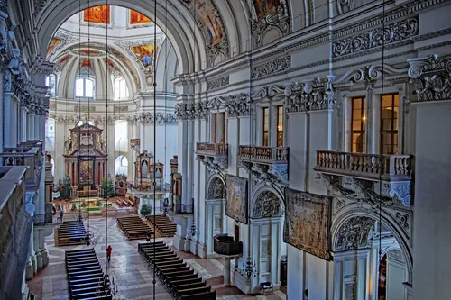 잘츠부르크 중심에 우뚝 서 있는 17세기 바로크 양식의 잘츠부르크 대성당은 도시의 대표 건축 명소 중 하나입니다. 쌍첨탑이 있는 인상적인 외관은 웅장한 돔, 화려하게 꾸며진 채플, 정교한 스투코 장식이 돋보이는 경이로운 내부로 이어집니다. 이 유적지는 성 루퍼트와 성 베르게리우스에게 헌정되었으며, 작곡가 볼프강 아마데우스 모차르트가 세례받은 장소로 유명합니다. 예술 작품이 가득한 대성당 박물관과 이전 교회의 흔적을 볼 수 있는 지하 예배당도 놓치지 마세요. 활기찬 광장과 시장에 둘러싸인 이 대성당은 문화와 영혼의 중심지로서 잘츠부르크의 유구한 역사를 엿볼 수 있습니다.