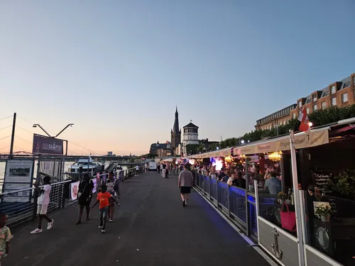 De Rheinuferpromenade in Düsseldorf is een schilderachtige wandelpromenade langs de oostelijke oever van de Rijn, die naadloos de historische Altstadt (oude stad) verbindt met het moderne en levendige MedienHafen-district. Deze schilderachtige wandelroute is populair bij zowel toeristen als locals en biedt prachtige uitzichten op de rivier en de iconische Rheinturm (Rijntoren). Ideaal voor ontspannen wandelingen, fietsen, of het genieten van de alfresco diners die worden aangeboden door talrijke cafés en restaurants, komt de promenade tot leven met straatartiesten en levendige markten. Perfect getimed kunt u betoverende zonsondergangen boven de rivier meemaken, wat het een essentiële bestemming in Düsseldorf maakt om de cultuur en sfeer van het gebied te ervaren.