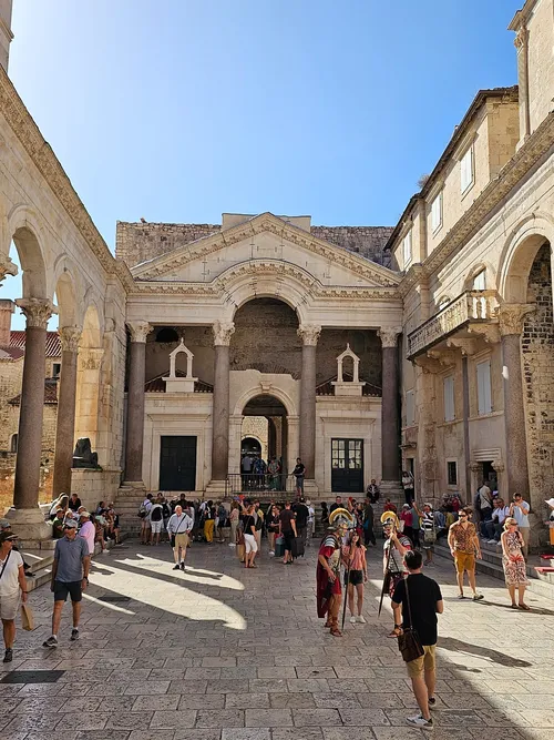 Gelegen in het hart van het Paleis van Diocletianus in Split, Kroatië, diende de Vestibul ooit als de ingang naar de keizerlijke residentiële vertrekken. Fotografen zullen geboeid zijn door het prachtige, cirkelvormige ontwerp en de manier waarop het natuurlijke licht door het oculus in het gewelfde plafond stroomt. Kom vroeg om de drukte te vermijden en de pure schoonheid van de oude Romeinse architectuur vast te leggen. De contrasterende texturen van de verweerde steen en de harmonieuze akoestiek maken het perfect voor het creëren van sfeervolle opnames. In de nabijheid treden vaak muzikanten op die traditionele Dalmatische klapa-muziek spelen, wat een authentiek auditief element toevoegt aan je visuele ervaring. Mis de kans niet om de omliggende smalle straatjes vol historische charme te fotograferen.