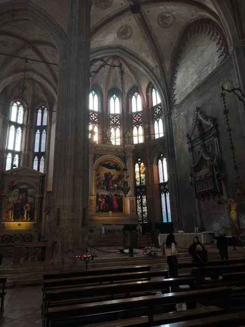 Bazylika S. Maria Gloriosa dei Frari ucieleśnia wenecki gotyk i mieści dzieła Tiziana, w tym słynne „Wniebowstąpienie Dziewicy” nad głównym ołtarzem. Kościół ten kryje również grób Tiziana oraz monumentalne mauzoleum rzeźbiarza Antonio Canovy. Zachwyć się wysoką nawą, misternymi ambonami chóru i drewnianą figurą św. Jana Chrzciciela autorstwa Donatella. Skromna fasada kryje bogato zdobione wnętrze, podkreślając franciszkańskie korzenie. Położony w dzielnicy San Polo, choć mniej uczęszczany, jest obowiązkowym punktem dla miłośników sztuki szukających autentycznego spojrzenia na religijne dziedzictwo Wenecji.
