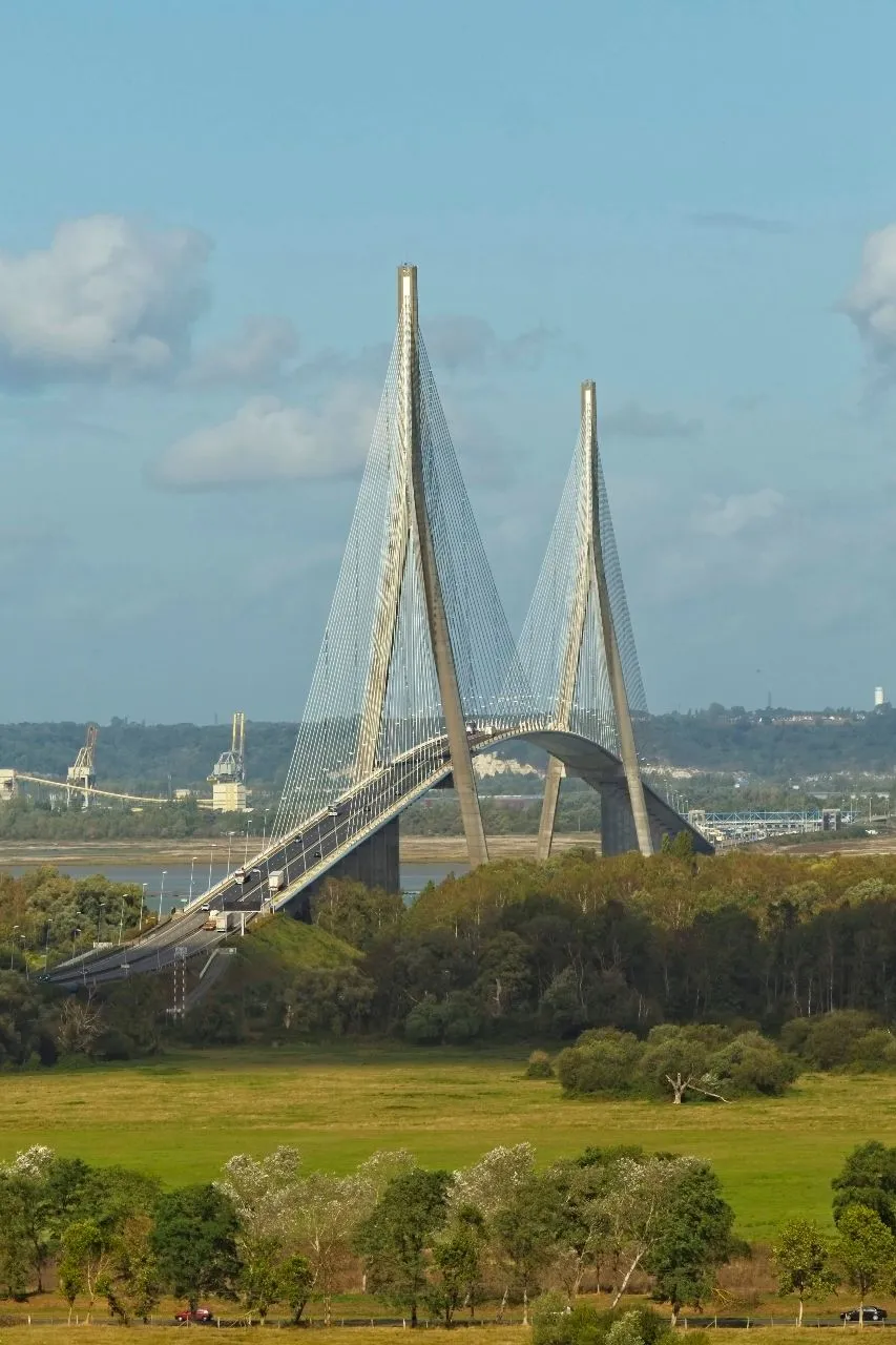 Pont de Normandie to imponujący most w La Rivière-Saint-Sauveur w Normandii we Francji. Dzięki najdłuższemu pojedynczemu przęsłu spośród wszystkich mostów wiszących we Francji jest to widok godny podziwu! Jego dwa filary wznoszą się 105 metrów nad Sekwaną i są dobrze widoczne z daleka. Jego elegancki wygląd tworzy oszałamiający kontrast z otaczającym krajobrazem, dzięki czemu jest ulubionym miejscem zdjęć wielu fotografów. Popularną rozrywką jest przejście przez most, aby poczuć wspaniałą perspektywę, jaką oferuje. W pobliżu obiektu przebiegają trasy rowerowe, z których można podziwiać okolicę i rzekę. Dla tych, którzy szukają spokojniejszej okolicy, polecamy pobliski park Oissel-Sud, który jest doskonałym miejscem na spokojny spacer lub piknik. Pont de Normandie z pewnością będzie niesamowitym widokiem dla każdego poszukiwacza przygód i podróżnika!