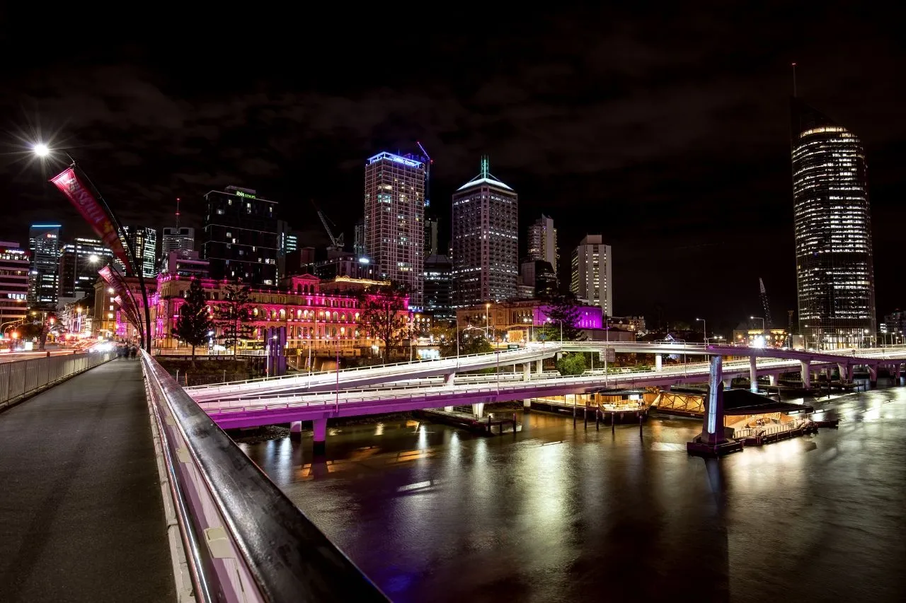 Brisbane Skyline și Victoria Bridge din South Brisbane, Australia sunt destinații perfecte pentru călători și fotografi. De pe impozantul pod Victoria, poți admira priveliști de neegalat ale orizontului orașului și râului Brisbane, ideale pentru a surprinde splendoarea orașului!