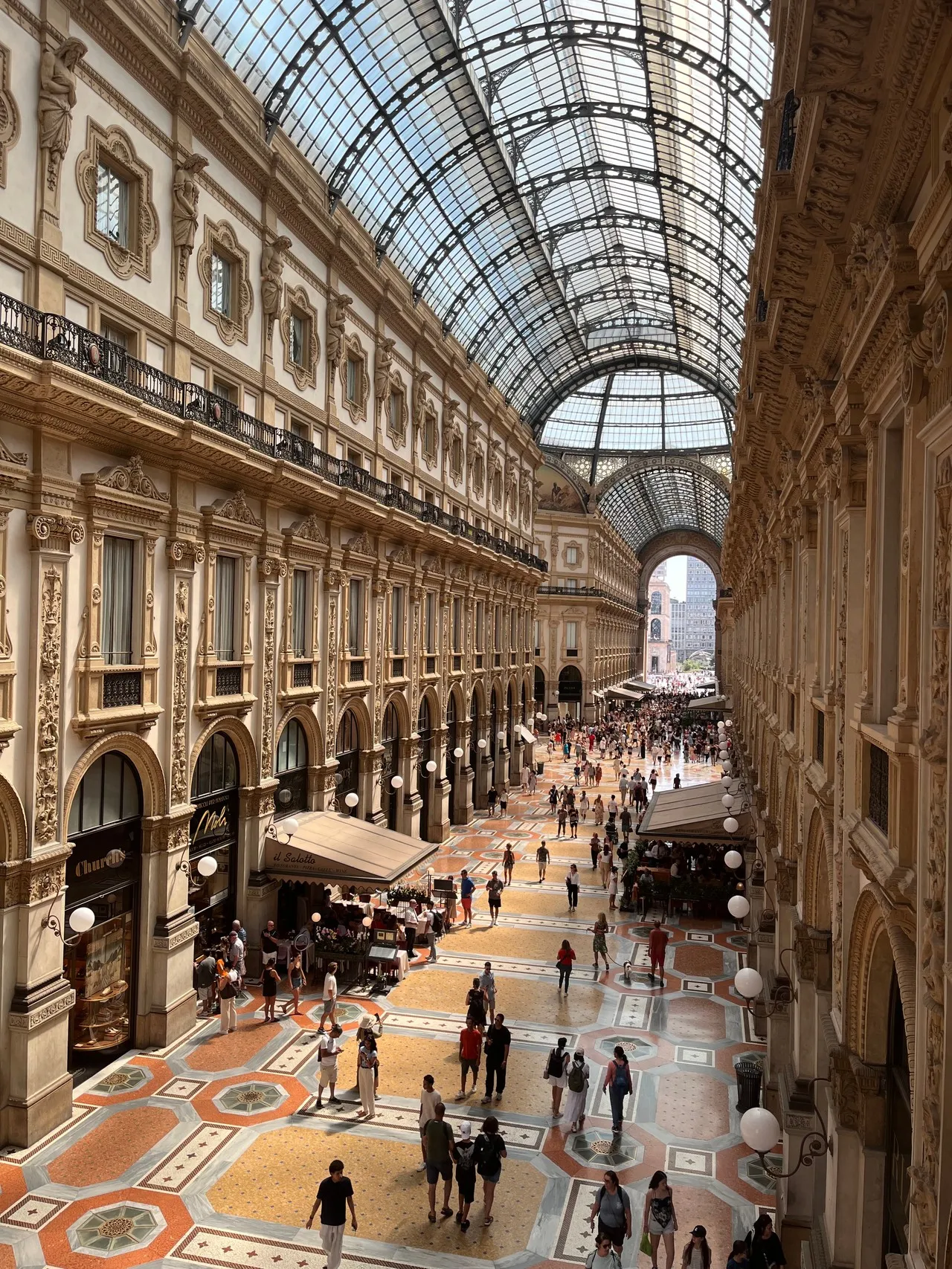 แกลเลอเรีย วิตตอริโอ เอมานูเอลที่ 2 เป็นห้างช็อปปิ้งใจกลางมิลานที่มีชื่อเสียงในสถาปัตยกรรมศตวรรษที่ 19 เพดานกระจกโค้งและโมเสกละเอียดมอบโอกาสถ่ายภาพสวยงาม โดยเฉพาะที่จุดตัดของทางเดินคู่ที่มีโดมกระจกน่าประทับใจ แสงสีทองท่วมโถงตอนพระอาทิตย์ตก แสดงให้เห็นงานเหล็กประณีตและจิตรกรรมฝาผนังหรูหรา สำหรับม่านภาพเฉพาะให้จับความแตกต่างระหว่างบูติกระดับไฮเอนด์กับรายละเอียดศิลปะนูโว มองขึ้นไปที่รูปแปดเหลี่ยมตรงกลางเพื่อภาพที่ลงตัวในลวดลายบนเพดาน ช่วงเช้าเป็นเวลาที่มีคนหลายน้อยสำหรับการถ่ายภาพมุมกว้างที่สมบูรณ์แบบ