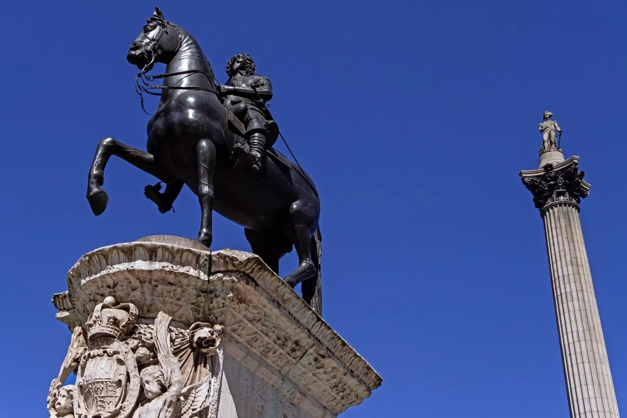 特拉法加广场南端的查理一世骑马雕像被认为是伦敦的正式中心。该青铜雕像由查理一世于1630年委托法国雕塑家于贝尔·勒苏尔打造,在英国内战动荡中得以保存,多亏一位当地金工未将其熔化。雕像展示了身着王室服饰的国王骑于骏马上,体现了斯图亚特时代的辉煌。游客可欣赏其作为伦敦最古老的骑马雕像和持久君主象征的重要意义,从附近的查令十字车站步行可达。
