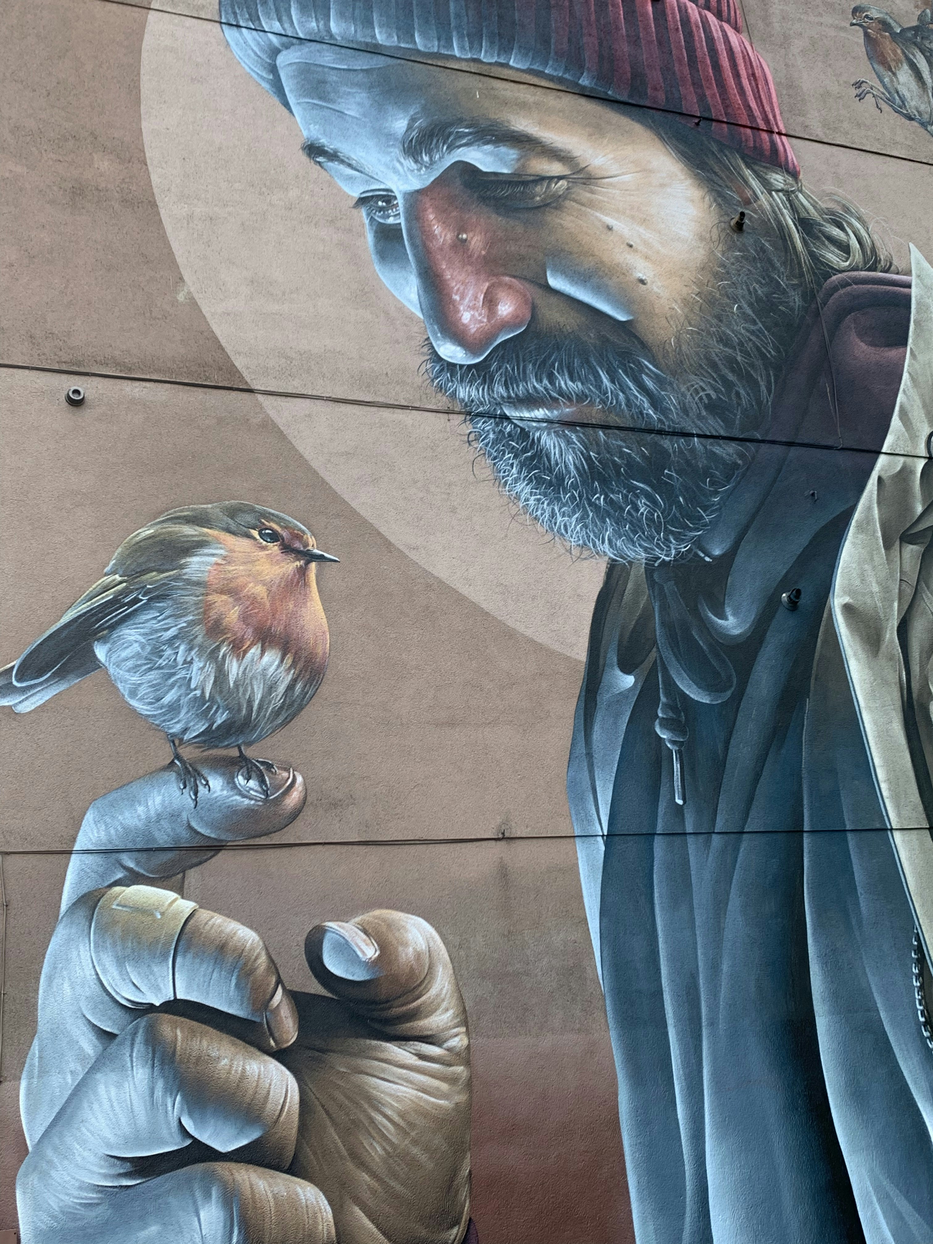 格拉斯哥市壁画小径上的第三幅壁画是高街的圣芒戈,是一幅充满活力和色彩的壁画。受格拉斯哥守护神的启发,格拉斯哥著名的壁画家 Rogue-One 创作了一幅令人兴奋的作品。这幅作品以手球场为背景,在五面墙上描绘了一天中从日出到傍晚的不同时间。它描绘了农作物在巨大的“G”上方生长和收获的场景,以提醒游客这座城市引以为豪的传统以及当前的文化。壁画的中心是格拉斯哥传奇的圣芒戈的超大版,他是这座城市的守护神。他站在龙的顶上,象征着这座城市及其人民的力量。这幅壁画生动而鼓舞人心,既展现了格拉斯哥的美丽,也展现了它充满活力和不断发展的身份。凭借其强烈的宗教象征意义和对城市文化的拥抱,这幅壁画令人着迷地提醒着人们格拉斯哥的力量。
